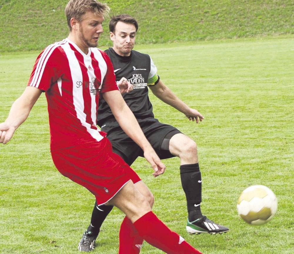 Stets torgefährlich: Dominik Lohne von Hombressen/Udenhausen (links) traf bislang 20 Mal. Im Hinspiel gegen Grebenstein ging er aber leer aus. Da hatte ihn Sebastian Feuring immer im Griff. Foto: zih/nh